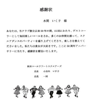 | 2025年10月19日、秋田コールツフートスクエアーズが創立50周年を迎え、アニバーサリーを盛大に開催されましたことに、あらためてお慶び申し上げます。ゲストは我がスウィートファミリーの水間いく子氏。この記念の節目に、スウィートファミリーからも多数参加して、スクエアダンス愛好者との交流を深めることが出来ました。秋田の地域にスクエアダンスを広めたのは、小田内様の熱意の賜物と深く敬意を表します。出逢いはいつも刺激と感動を与えてくれますね!楽しい50周年のお祝い会でした。Congratulatulations