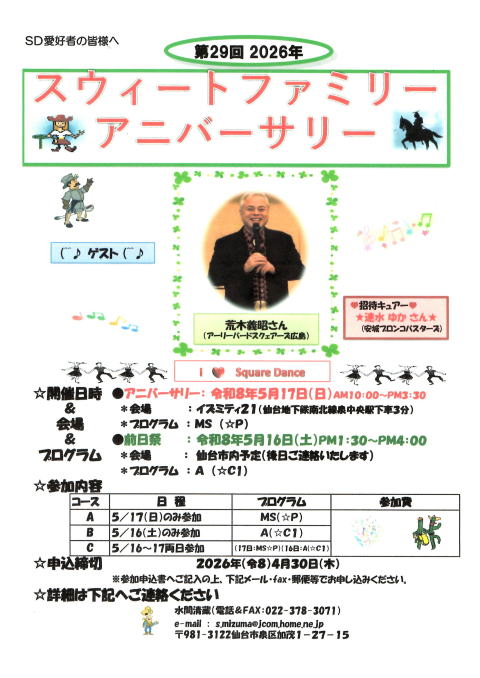 | 2026年5月17日(日)10時~15時30分イズミティー21において、 第29回スウィートファミリーアニバーサリーを開催致します。 ゲストは荒木義昭さん(アーリーバードスクエアーズ広島)、 招待キュアー速水ゆかさん(安城部ロンコバスターズ)をお招きして開催致します。 是非スクエアダンス愛好者様のご参加を心よりお待ち申し上げます。 詳細につきましてチラシ問合せ先へご連絡いただければ幸いです。 又前日祭を5月16日(土)13時30分~16:00(会場:仙台市内後日連絡)を計画致しております ![]() |